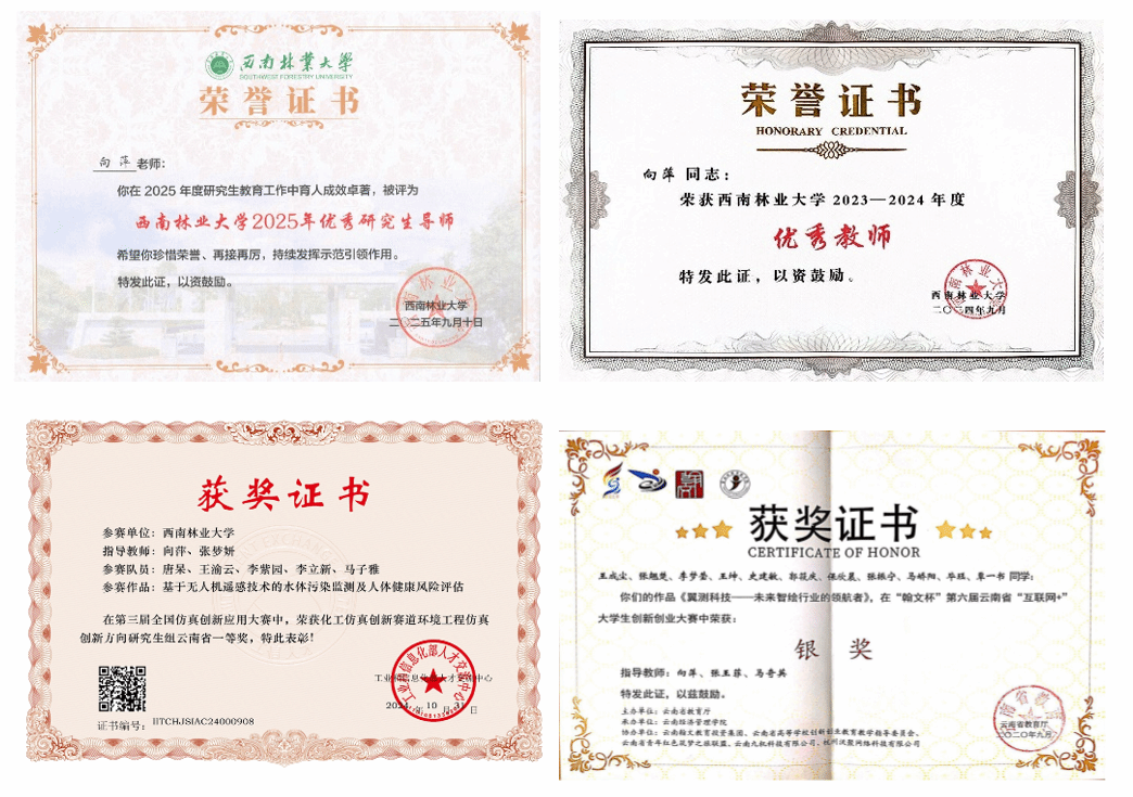 在研究生培养上,向萍导师探索构建了“阶梯式能力培养”与“跨学科协同指导”的创新模式。他注重因材施教和学术诚信,通过个性化培养方案和“导师-学长”双轨制,全方位提升学生的创新能力和综合素养。迄今,团队已培养研究生30余名,学生多人荣获云南省优秀硕士学位论文、国家奖学金,并在“互联网+”等国家级竞赛中屡获佳绩。毕业生或进入知名学府深造,或服务于高校、科研院所与政府部门,成为生态环保领域的骨干力量,培养成效显著。